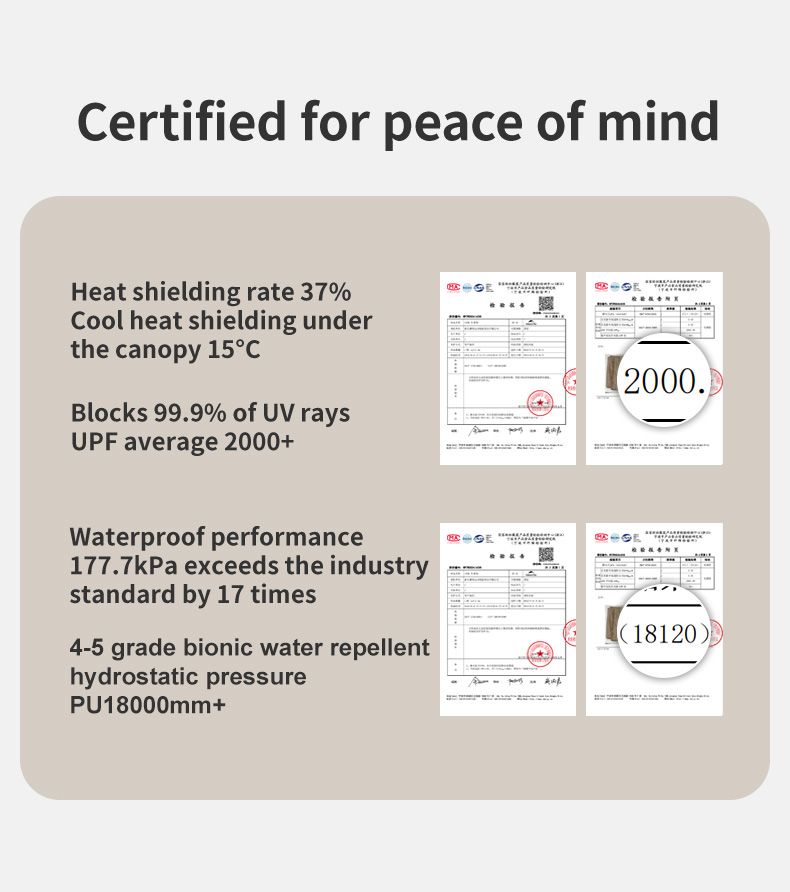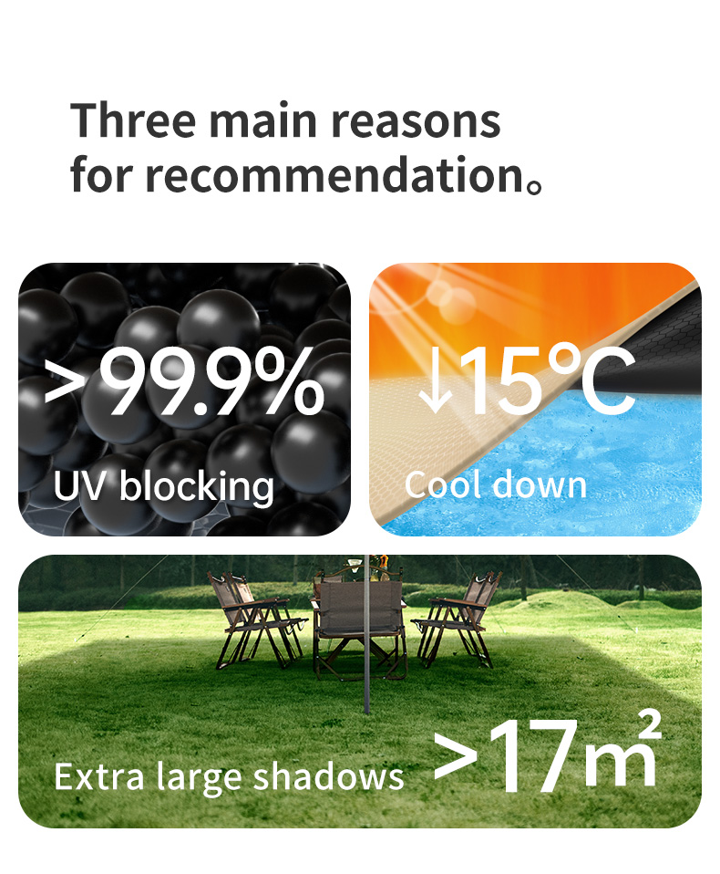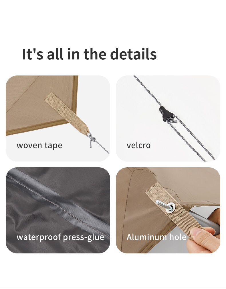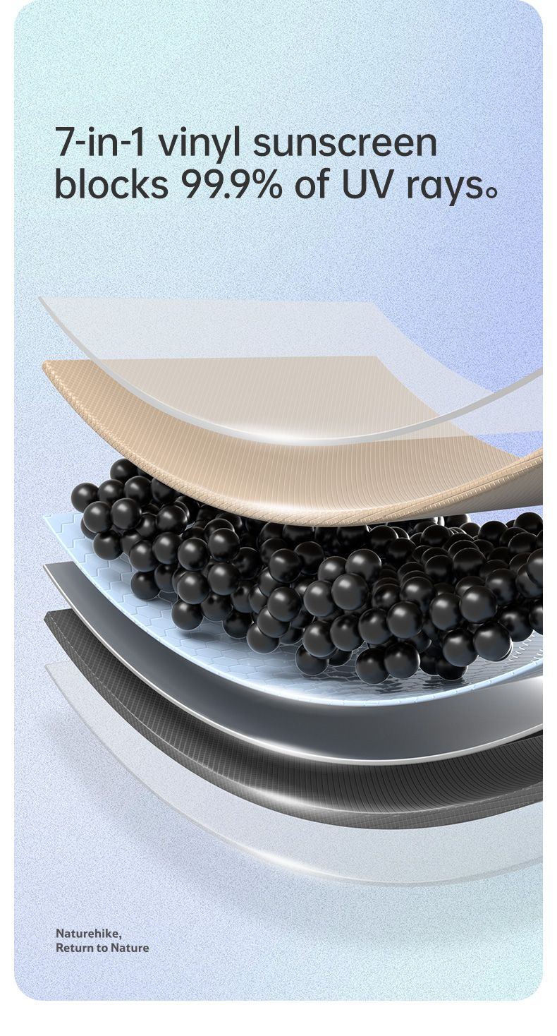 Thiết kế với 7 lớp chống nắng mạnh mẽ, cùng khả năng chặn 99,9% tia UV để bảo vệ làn da của bạn khỏi tác động có hại của ánh nắng mặt trời. 7 lớp bao gồm lớp lá sen giúp chống thấm nước, lớp sợi bảo vệ bảo vệ da khỏi tác động của tia UV, lớp Vinyl cản sáng giúp hạn chế tác động của ánh nắng mặt trời, lớp cảm quang giúp giảm thiểu tác động của tia UV đến làn da, lớp phủ phản nhiệt giúp hấp thụ nhiệt độ, lớp định hình Vinyl giúp giữ dáng cho bộ tăng bạt, và lớp sơn chống thấm PU giúp bảo vệ bề mặt khỏi tác động của môi trường. Tất cả những tính năng này kết hợp cùng nhau tạo nên một bộ tăng bạt cắm trại chất lượng và an toàn cho bạn khi sử dụng.