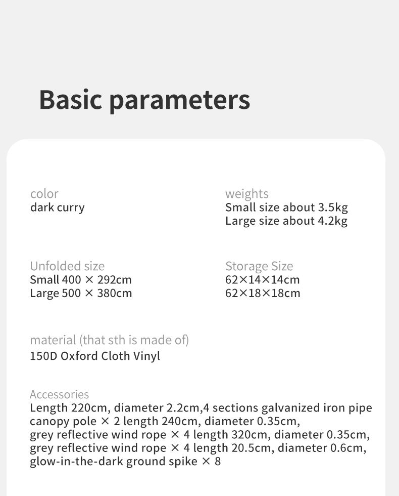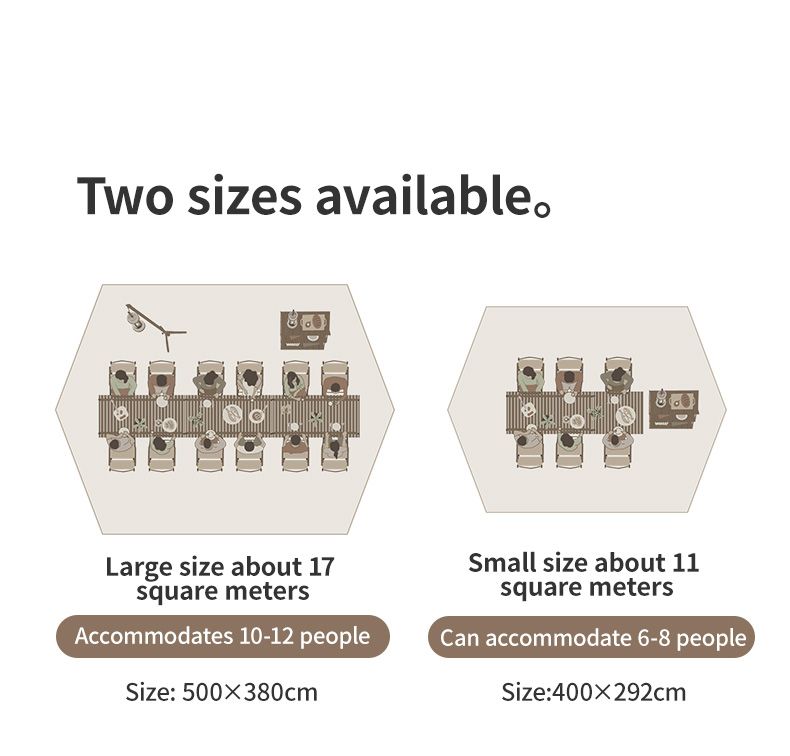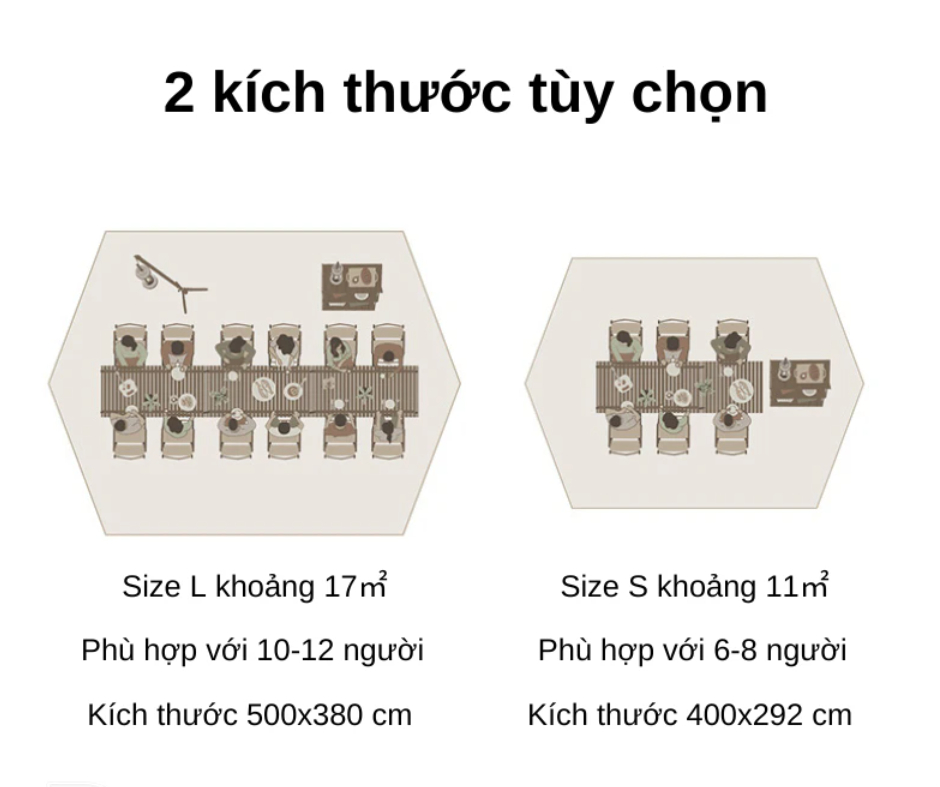 Với tầm nhìn rộng lớn và không gian thoải mái, tăng bạt này sẽ là lựa chọn lý tưởng cho những cuộc tụ họp cắm trại với số lượng người từ 10 đến 12. Với diện tích che phủ lớn hơn 17㎡, bạn có đủ không gian để tận hưởng cùng gia đình và bạn bè mỗi khi ra ngoại ô hay khám phá thiên nhiên. Đồng thời, bộ tăng bạt dã ngoại cũng mang đến sự thoải mái và tiện nghi cho mọi người trong nhóm, giúp cho kỳ nghỉ của bạn trở nên thú vị và đáng nhớ hơn bao giờ hết.