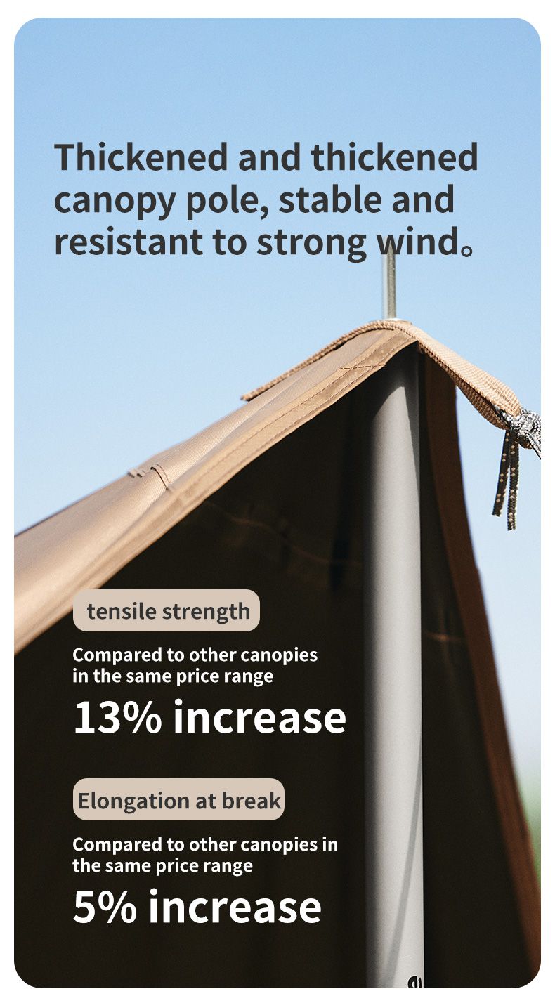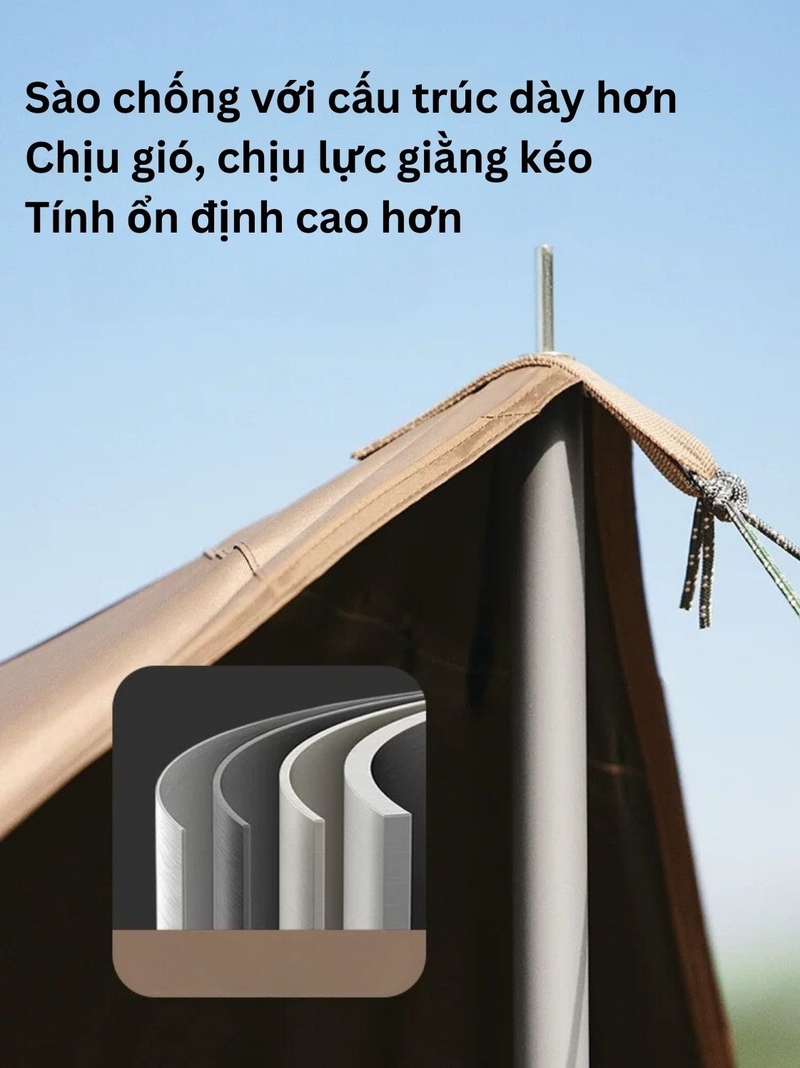 Với khung dày và ổn định chịu được gió mạnh, đây là lựa chọn lý tưởng cho những chuyến đi dã ngoại trong điều kiện gió mạnh. Thiết kế khung được làm dày nhiều lớp, hỗ trợ mạnh mẽ. Khóa đàn hồi giữa mỗi thanh khung giúp kết nối ổn định và bền bỉ vào mọi điều kiện thời tiết. Với cấu trúc này, bộ tăng có thể đảm bảo an toàn cho người sử dụng trong mọi hoàn cảnh. Không chỉ vậy, việc sử dụng khóa đàn hồi cũng giúp cho việc lắp ráp và tháo dỡ trở nên dễ dàng hơn. Điều này giúp tiết kiệm thời gian và công sức cho người sử dụng, đem lại trải nghiệm ngoại trời an toàn và thoải mái hơn, đồng thời tận hưởng tự do và gần gũi với thiên nhiên hơn.