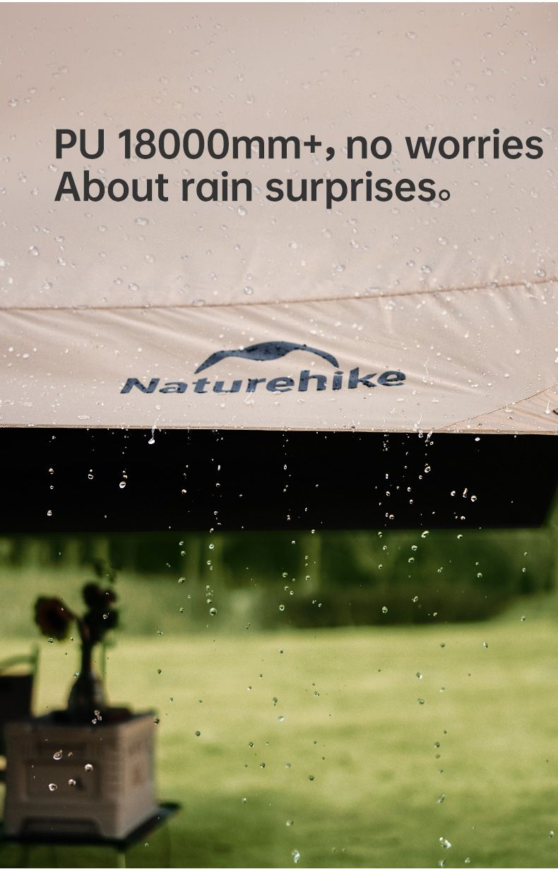 Những cơn mưa bất ngờ không còn là nỗi lo lớn khi sản phẩm sở hữu chất liệu chống nước PU1800mm+. Được thiết kế đặc biệt để chống thấm nước với chỉ số chống nước cao, chất liệu này sẽ giữ cho bạn và gia đình khô ráo và an toàn trong mọi điều kiện thời tiết. Nhờ có mái che cắm trại chống mưa này bạn có thể thoải mái thưởng thức chuyến đi cắm trại mà không phải lo lắng về những cơn mưa bất ngờ nữa.