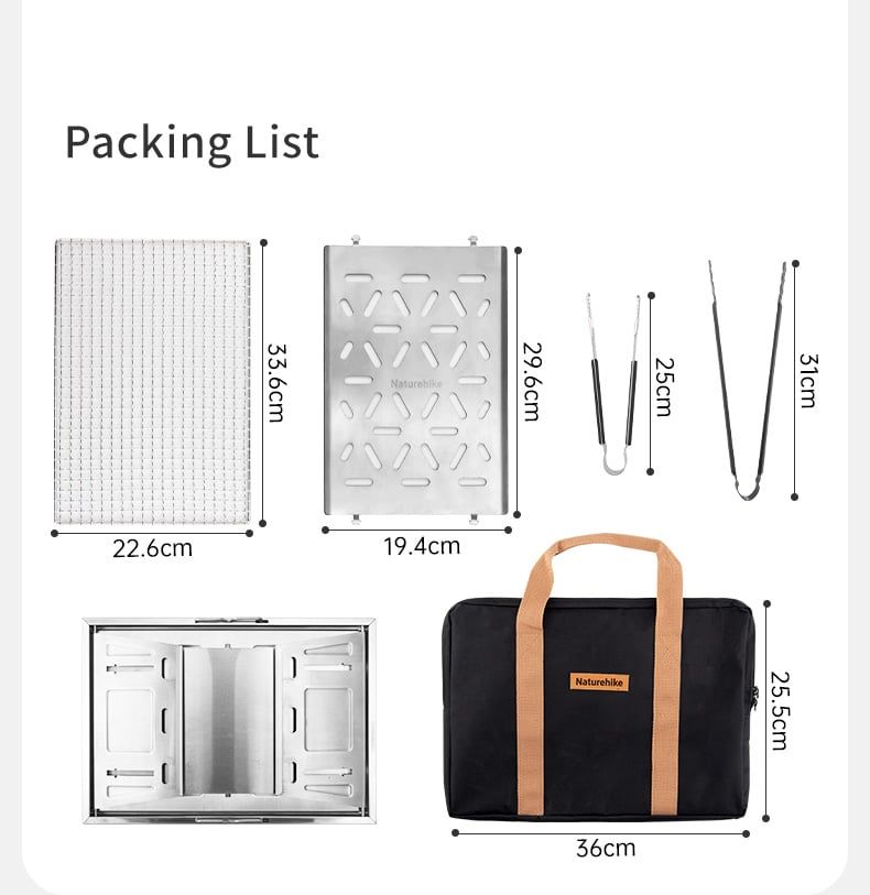 - Đóng gói: Túi đựng bếp; Khay nướng; Thân bếp gấp gọn; Vỉ đựng than; Vỉ đựng tro; Kẹp gắp thực phẩm & Kẹp gắp than nướng