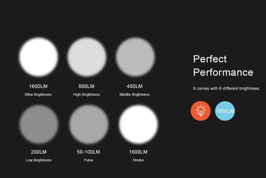 - Thời lượng pin: Sáng 1600Lm 1h30'; Sáng 800Lm 3h30'; Sáng 400Lm 6h; Sáng 200Lm 11h20'; Sáng chớp 1600Lm 2h20'; Sáng SOS 38h